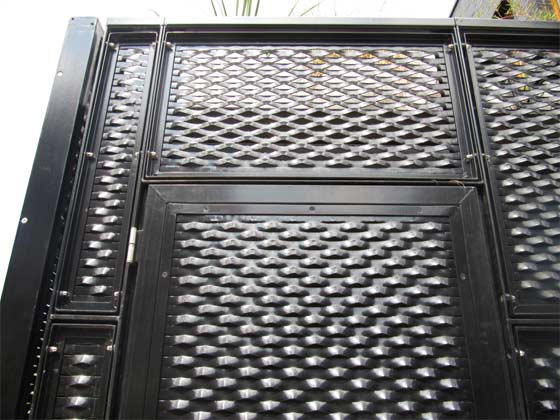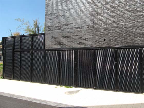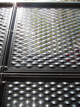 Garden fences Nieuw Leyden Leiden, 2009. The modern character of these newly built homes is emphasized by the specific colour and execution of the garden fences. The applied d-ko expanded metal, design Ministry, has vitrage like characteristics. Seen under a certain oblique angle you can see throug it but seen under a straight angle the surface seems opaque.