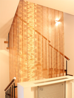 Vana Scala Como, April 2010. When illuminated this exclusive wire mesh with its irregular transparency creates an infinite range of metallic reflexion, guaranteeing a spectacular effect. This d-sign weave type River 30-3 is made from a combination of stainless steel and copper. The copper wire was chosen to harmonize the mesh with the existing wooden stairs.